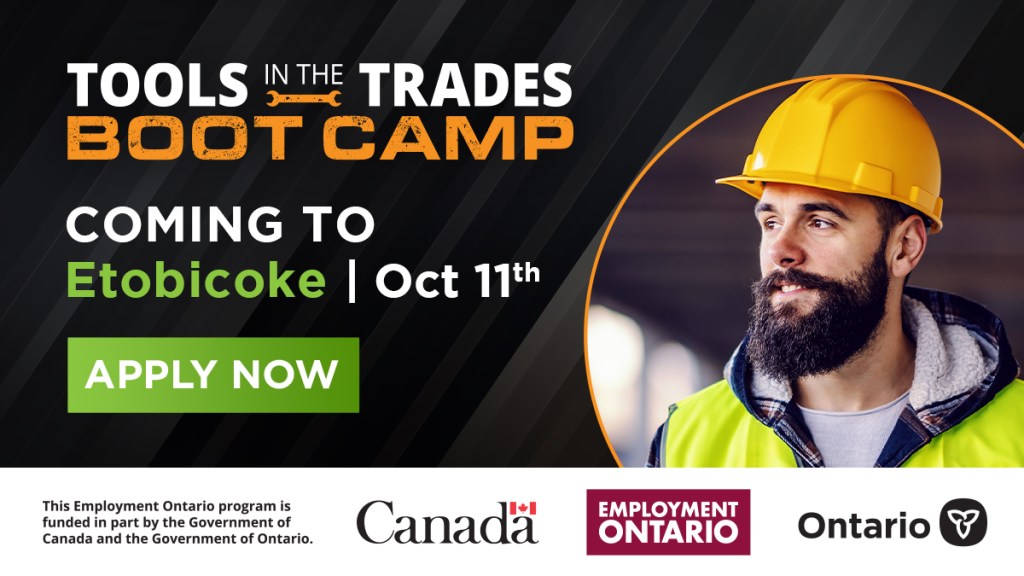 The Tools in the Trades Boot Camp is coming to Etobicoke on October 11th. This event is for adults not currently enrolled in full-time education and who are interested in the trades, and it’s FREE! Apply today! Spots are limited.