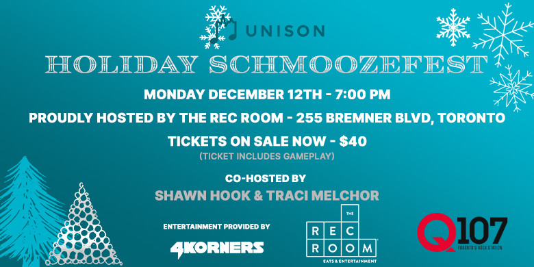 Unison’s Holiday Schmoozefest is the music industry’s very best seasonal schmooze and this year it’s back, bigger and better than ever at a new venue. This year’s Schmoozefest is being held on Monday, December 12th at The Rec Room Toronto, it’s the party of the season you won’t want to miss.
