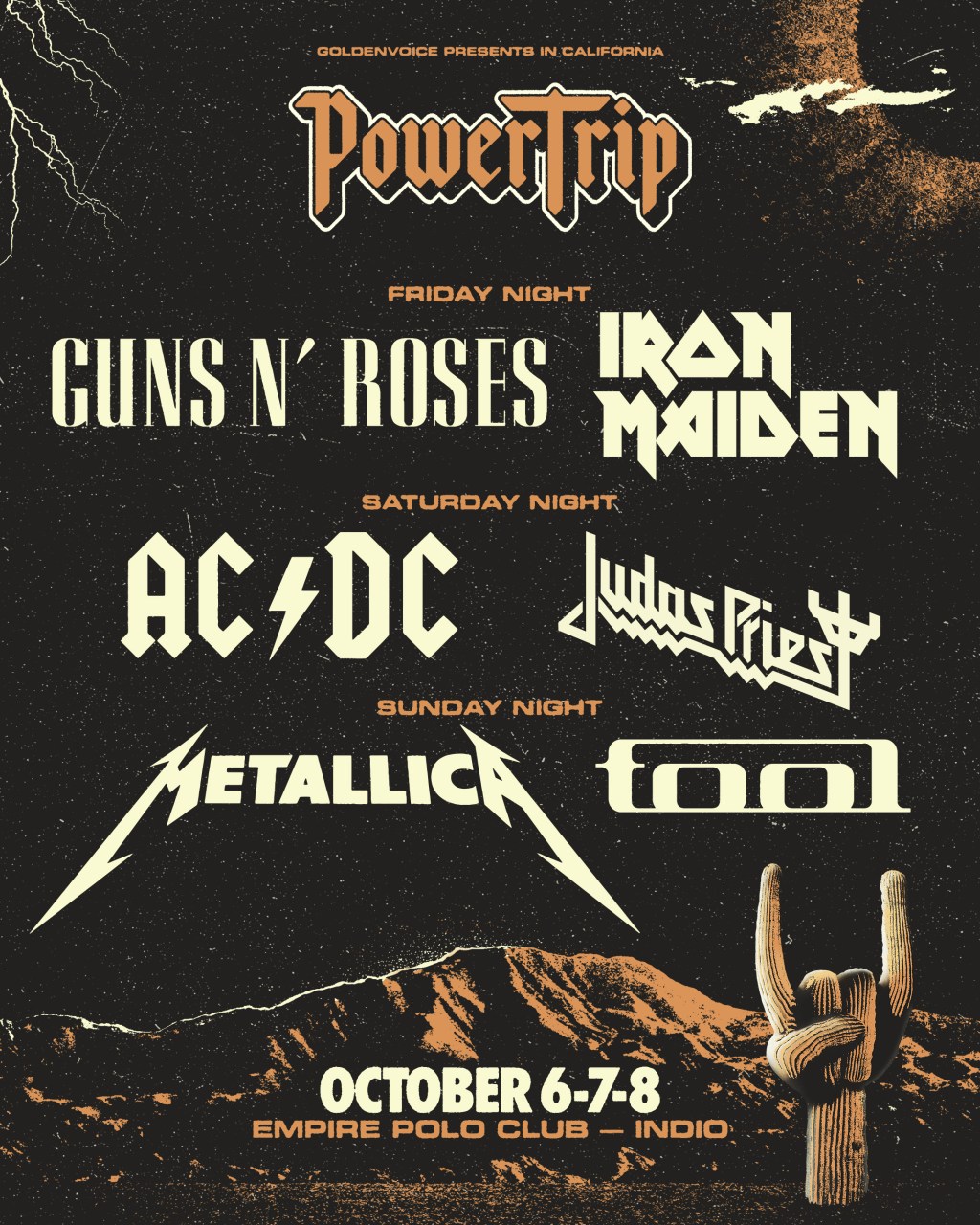 PowerTrip: Goldenvoice Presents in California Where Indio , California , US Map When Oct 06/23 11:00 AM - Oct 08/23 11:59 PM Age 19+ POWETRIP October 6-7-8 Empire Polo Club-Indio, California W/ Guns N’ Roses, Iron Maiden, AC/DC, Judas Priest, Metallica & Tool