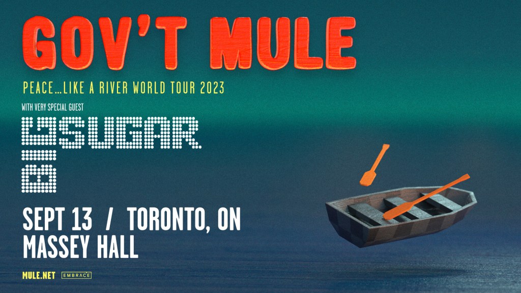 Gov’t Mule: Peace Like A River World Tour Where Massey Hall, 178 Victoria St,, Toronto, Ontario, M5B 1T7 Map When Sep 13/23 05:00 PM - Sep 13/23 11:00 PM Age All Website https://www.ticketmaster.ca/event/10005ED6D8762B4D Embrace Presents Gov’t Mule: Peace Like A River World Tour with Big Sugar September 13, 2023 Massey Hall