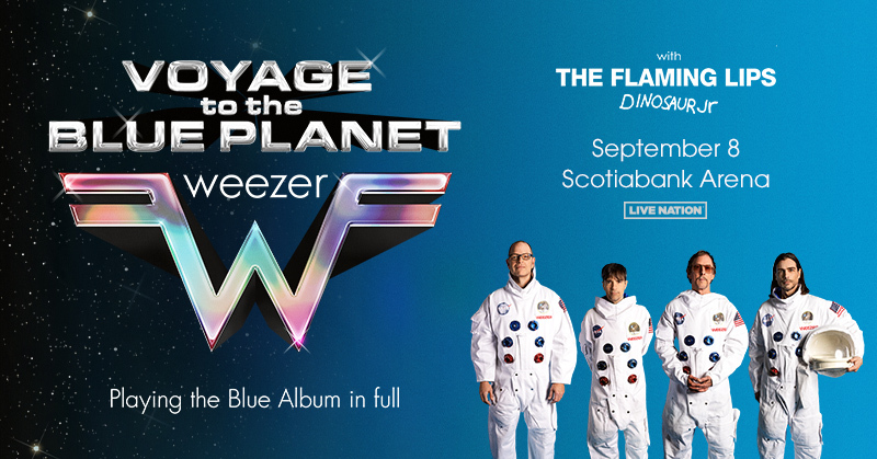 Weezer 2024 Where Scotiabank Arena , 40 Bay St, Toronto, ON, M5J 2X2, Canada Map When Sep 08/24 05:00 PM - Sep 08/24 11:00 PM Age All Website https://www.ticketmaster.ca/event/10006066F3FF3FCD WEEZER VOYAGE to the BLUE PLANET Playing the Blue Album in full with The Flaming Lips & Dinosaur Jr. September 8th at Scotiabank Arena
