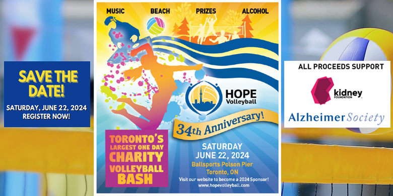 Come join the party and play in Toronto’s largest one day charity volleyball bash with an amazing DJ, sand, auction, prizes and alcohol. Have fun while supporting Alzheimer Society Toronto and The Kidney Foundation, Ontario. Register online at www.hopevolleyball.com