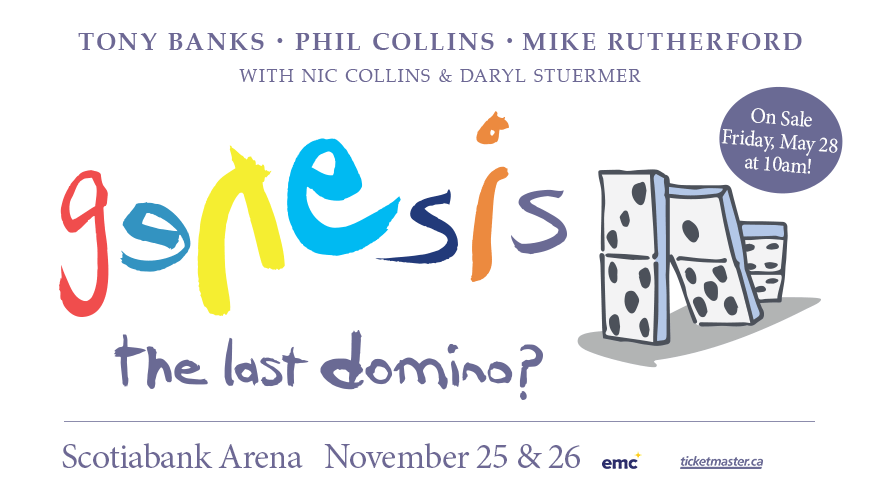 Genesis The Last Domino? – North American Tour Where Scotiabank Arena, Toronto, Ontario Map When Nov 26/21 08:00 PM - Nov 26/21 11:59 PM Age All Website https://www.genesis-music.com/