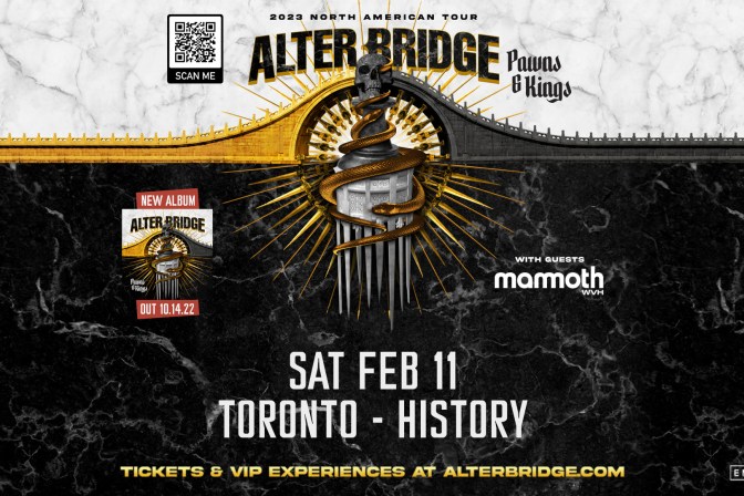 History, Toronto Q107 welcomes Alter Bridge: Pawns & Kings Tour with special guest Mammoth WVH to History on February 11, 2023! Tickets are on sale Friday, August 26 at 10am at Ticketmaster.ca.