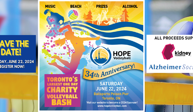 Ballsports Polson Pier, 176 Cherry St, Toronto, ON 34th Annual HOPE Charity Volleyball Bash Come join the party and play in Toronto’s largest one day charity volleyball bash with an amazing DJ, sand, auction, prizes and alcohol. Have fun while supporting Alzheimer Society Toronto and The Kidney Foundation, Ontario. Register online at www.hopevolleyball.com A great DJ, Beer Sales, Silent Auction, Fun Festivities, Giveaways […]