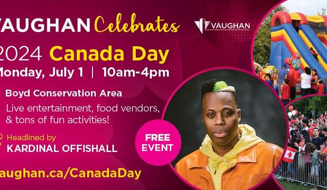 Boyd Conservation Area Park, Vaughan Save the date for the City of Vaughan’s annual Canada Day celebration. Monday, July 1, 2024 10am to 4pm Boyd Conservation Area Park, 8739 Islington Avenue, Vaughan The event will feature incredible stage entertainment, activities for all ages, a food zone, a marketplace with vendor booths and so much more.